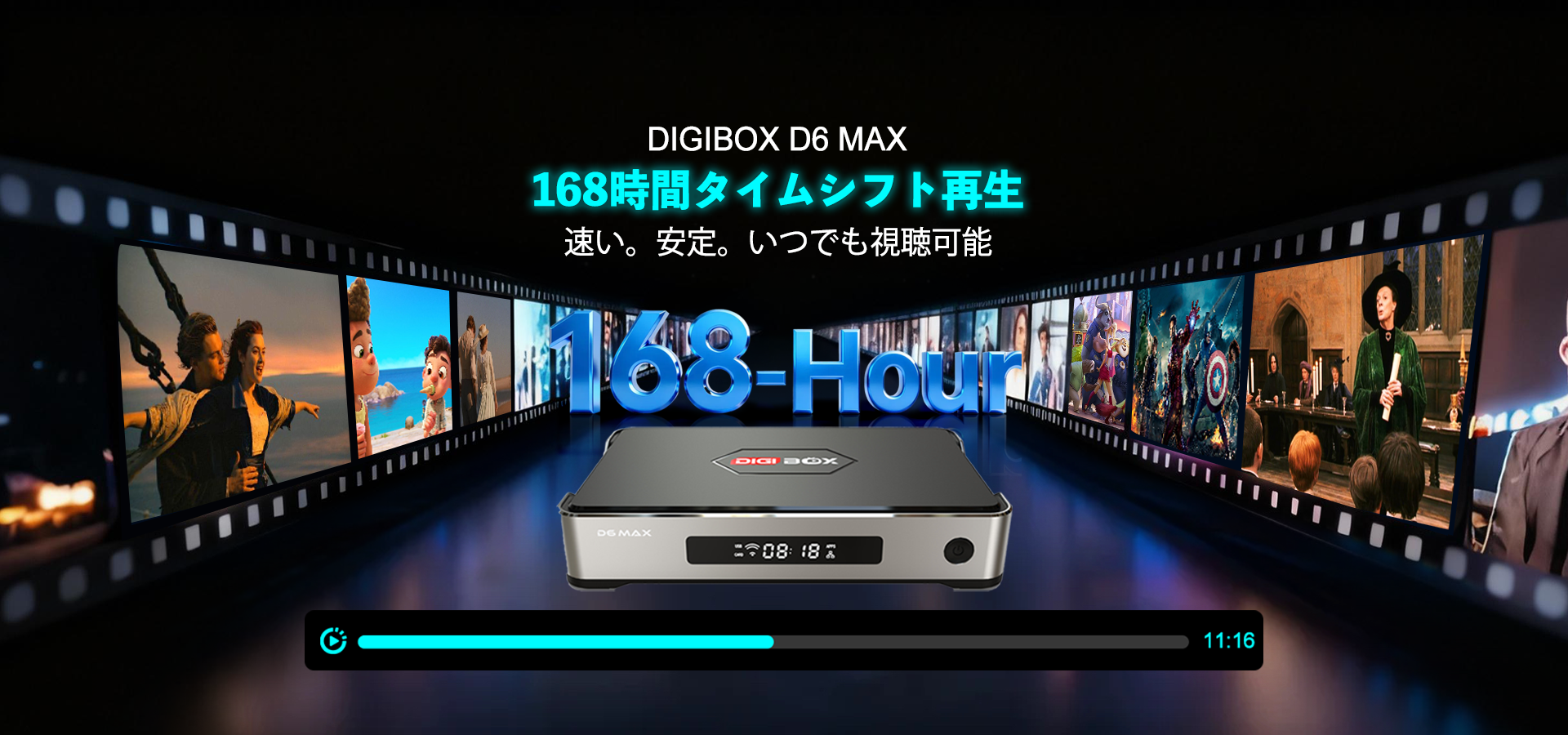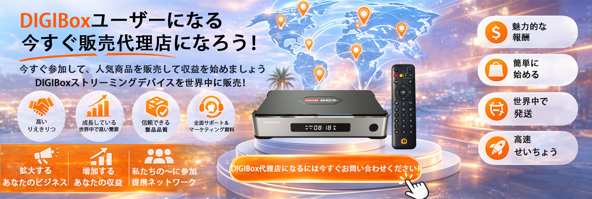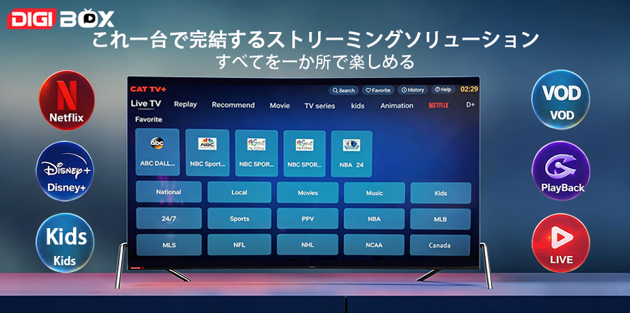 日本でも地球の裏側でも、DIGIBox は世界的な互換性を提供します。インターネット接続があればどこからでもコンテンツをストリーミングして、グローバルなエンターテイメント体験をお楽しみください。